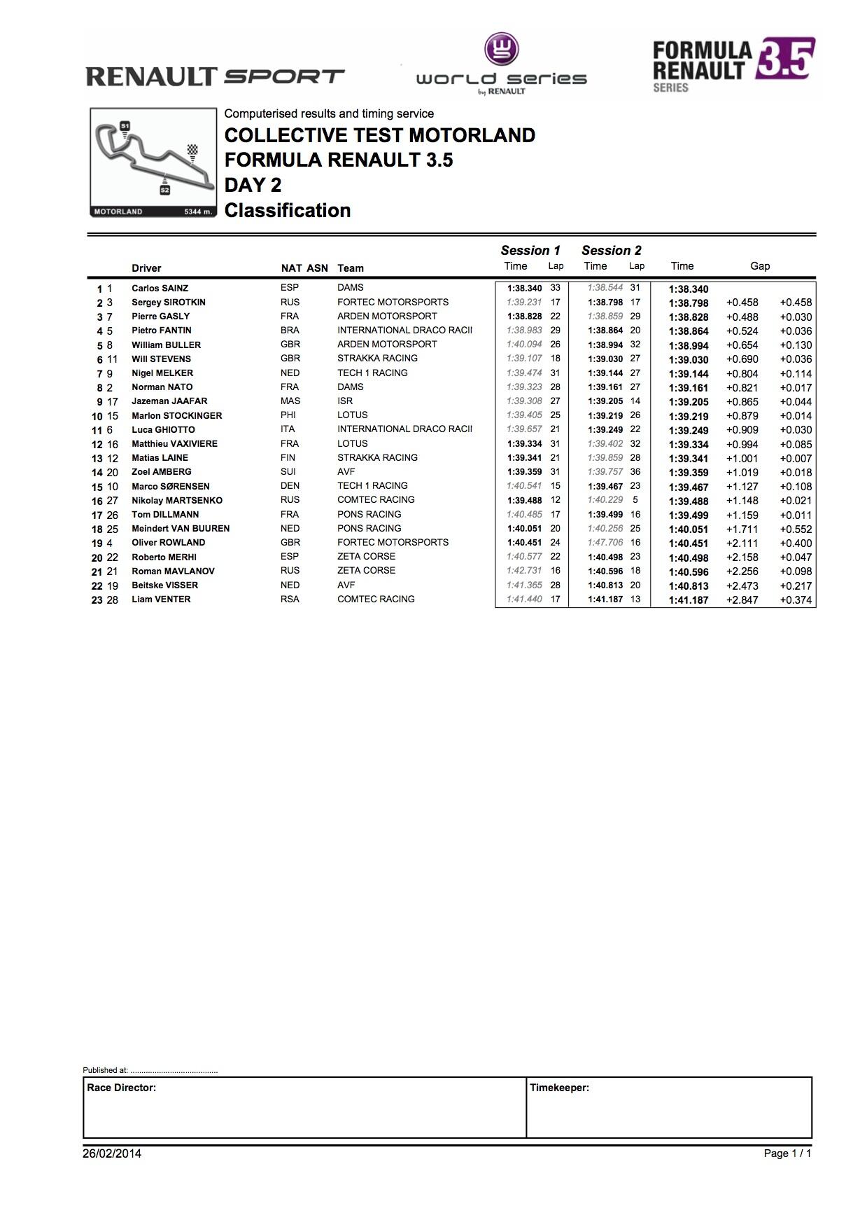 Dziś w barwach ekipy Pons zadebiutował Tom Dillmann, który uplasował się na siedemnastej pozycji. Francuz miał zapewnią posadę w Russian Time w GP2, jednak po śmierci Igora Mazepy nowi właściciele zdecydowali się zakontraktować Evansa i Markelowa. Dillmann również jutro zobaczymy na torze.